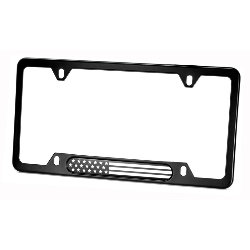 - Includes Stainless Steel screws and Black screw caps. Universal Frame size: 12"x 6". Suitable for any U.S. License Plate.