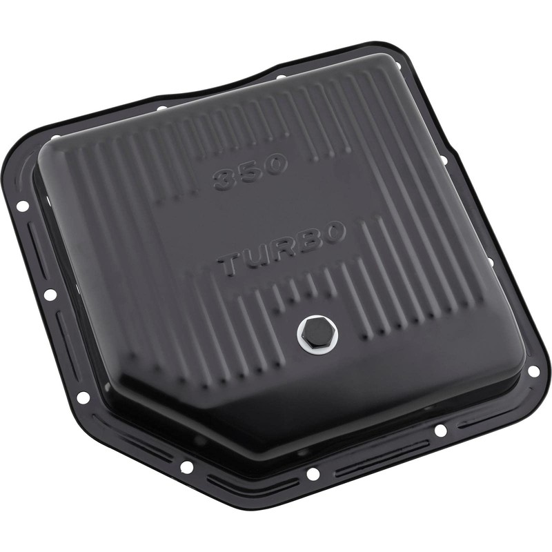Black Steel GM TH-350 Transmission Pan, 2-Inch Deep, Stock Capacity, Premium Steel Construction, Black Painted Finish, Includes Drain Plug, Durable Replacement Pan