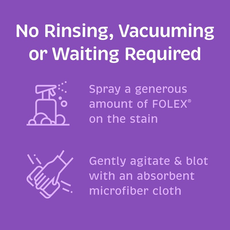 - EASY TO USE - No rinsing, vacuuming or waiting! Simply spray a generous amount of FOLEX on the stain, gently agitate, & blot with a clean, absorbent microfiber cloth or towel. Stains removed with FOLEX will not reappear after cleaning.