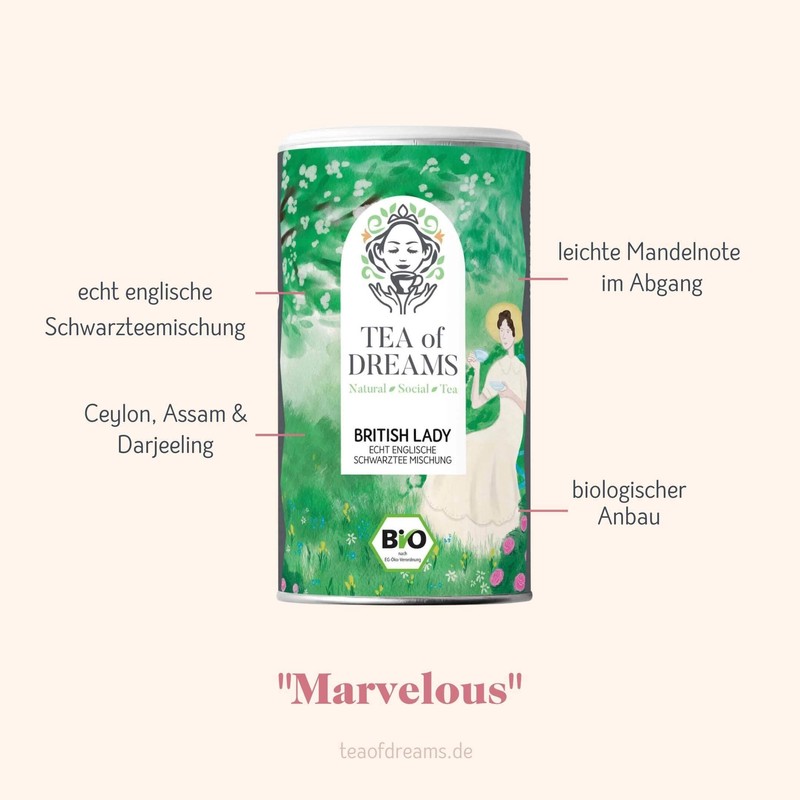 • Organic black tea: Discover "British Lady", a typical English black tea blend that impresses with its classic and aromatic, strong composition.