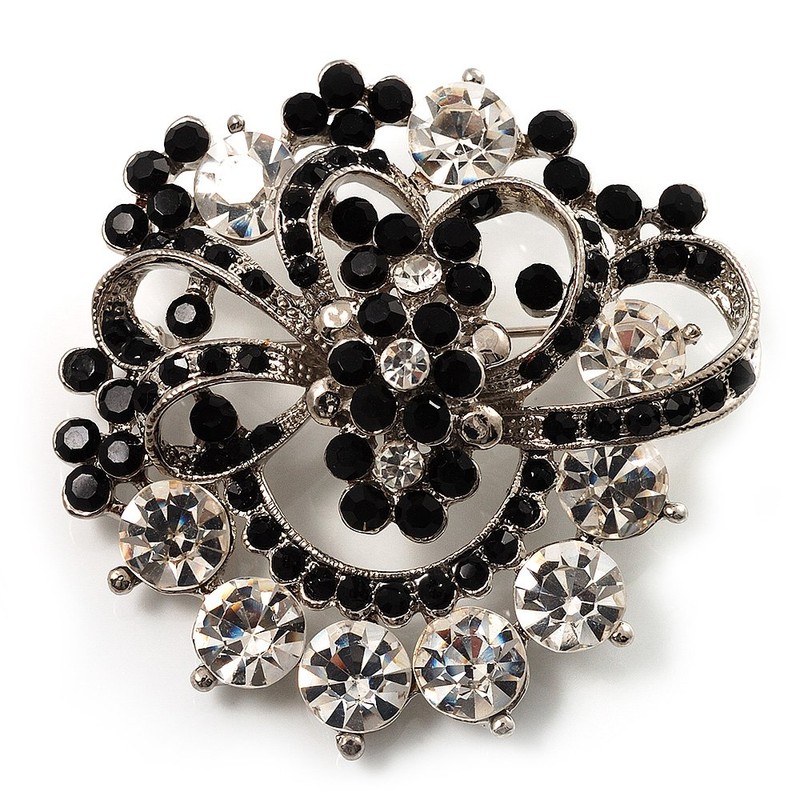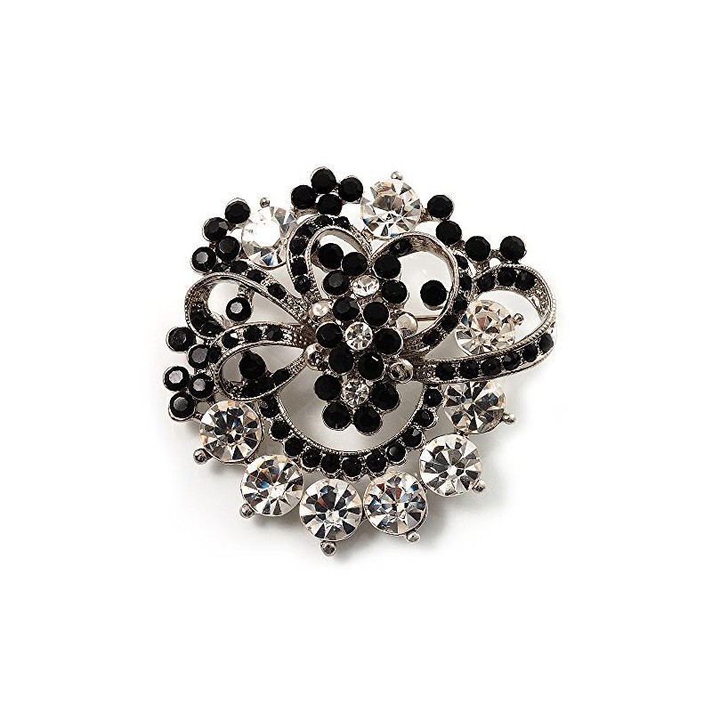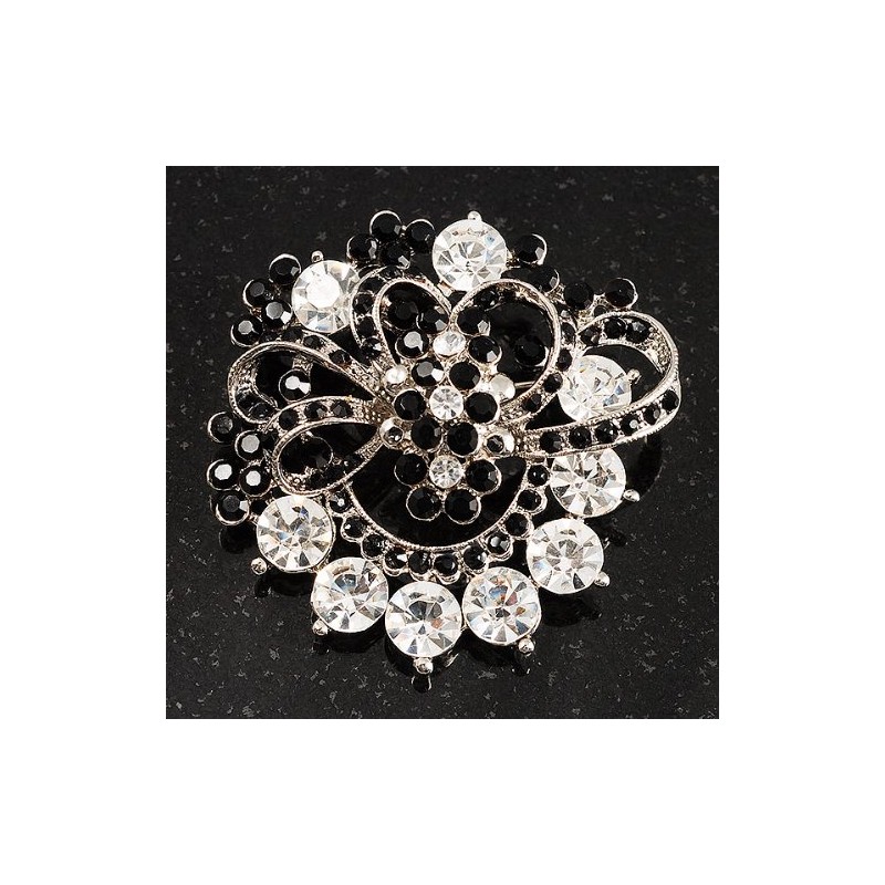 For an individual look, accessorise with this stunning Black & White Diamante Corsage Brooch. It features crystal-encrusted flowers set on the silver tone bow, surrounded with shocking jet black and clear crystal, round-cut stones offering a breathtaking look. The brooch will add instant elegance to day or evening wear. Pin this striking beauty at the bottom of a V-neck The brooch measures about 50mm x 50mm and secures with a bar and swivel clasp fastener.
