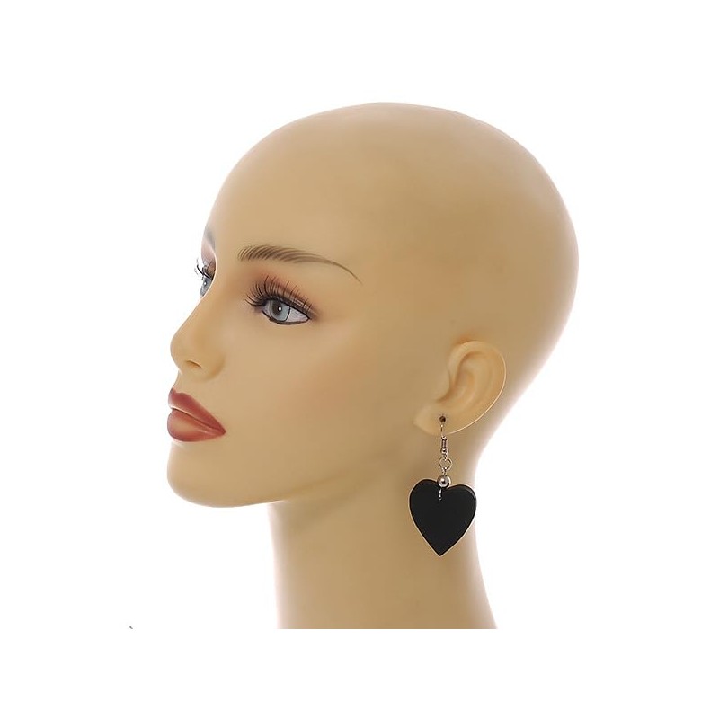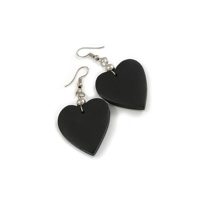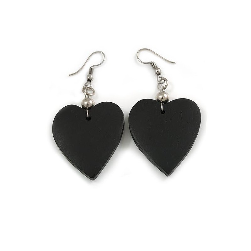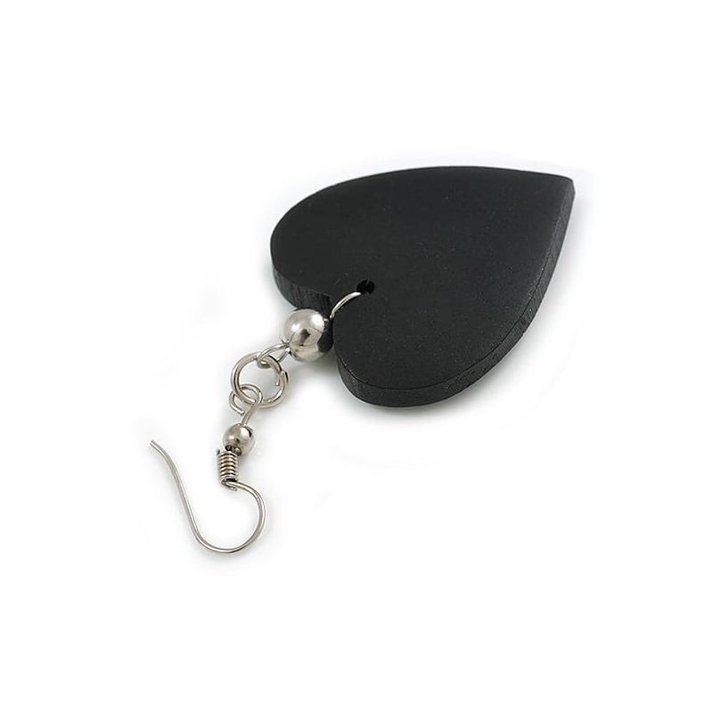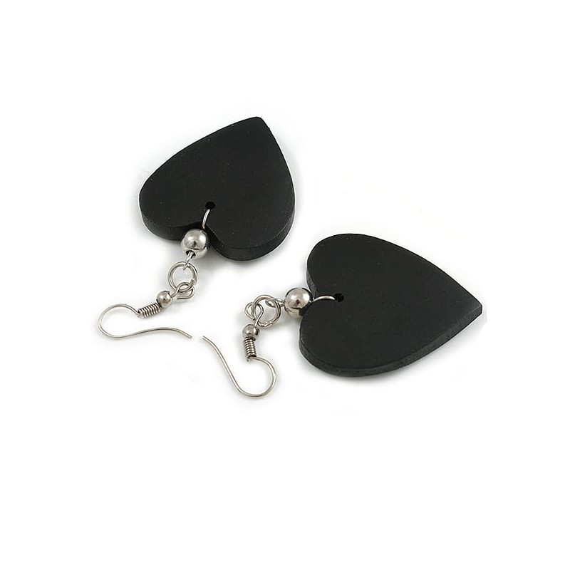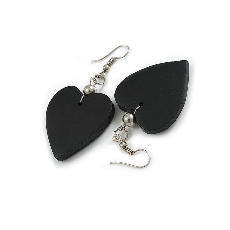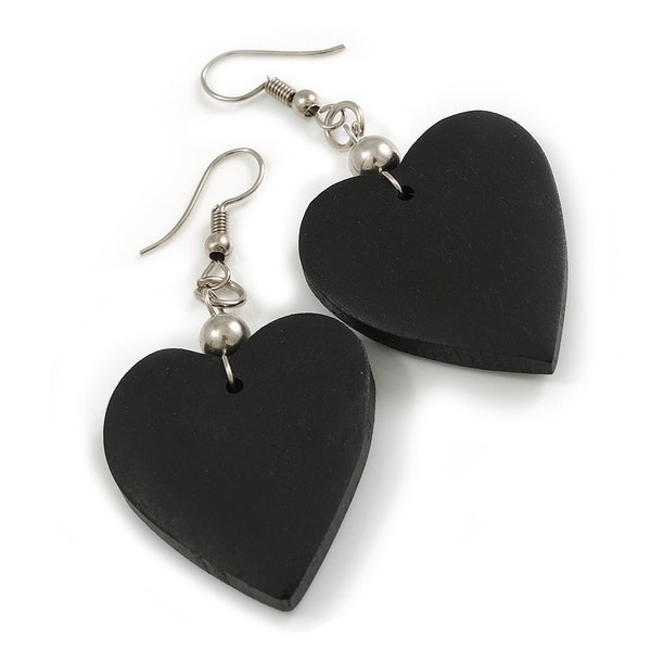 Black Wood Heart Drop Earrings - 60mm L