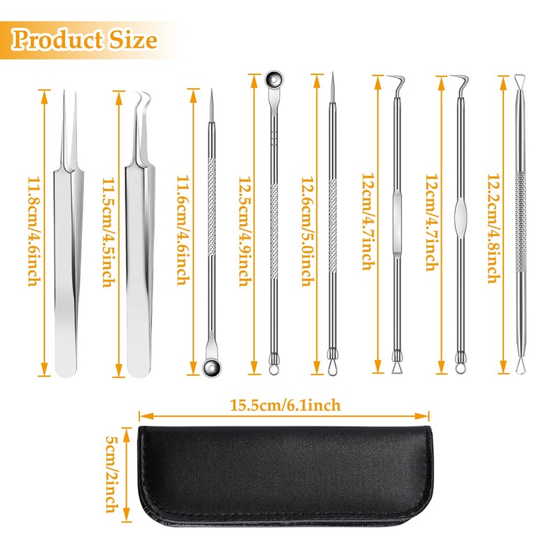 - 9-in-1 blackhead remover set: this set contains 6 professional tools for blackheads and pimples, 2 blackhead tweezers and 1 sheet pimple patch.