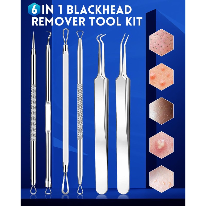 - 【Blackhead Remover Tool】These 6 in 1 different black head remove tool can help remove blackheads, whiteheads, acne, various blemishes and pimples on the chin, cheeks, forehead and nose with ease. This pimple popper tool allows you to keep your face clean and smooth at home, and it's much cheaper than a beauty salon.