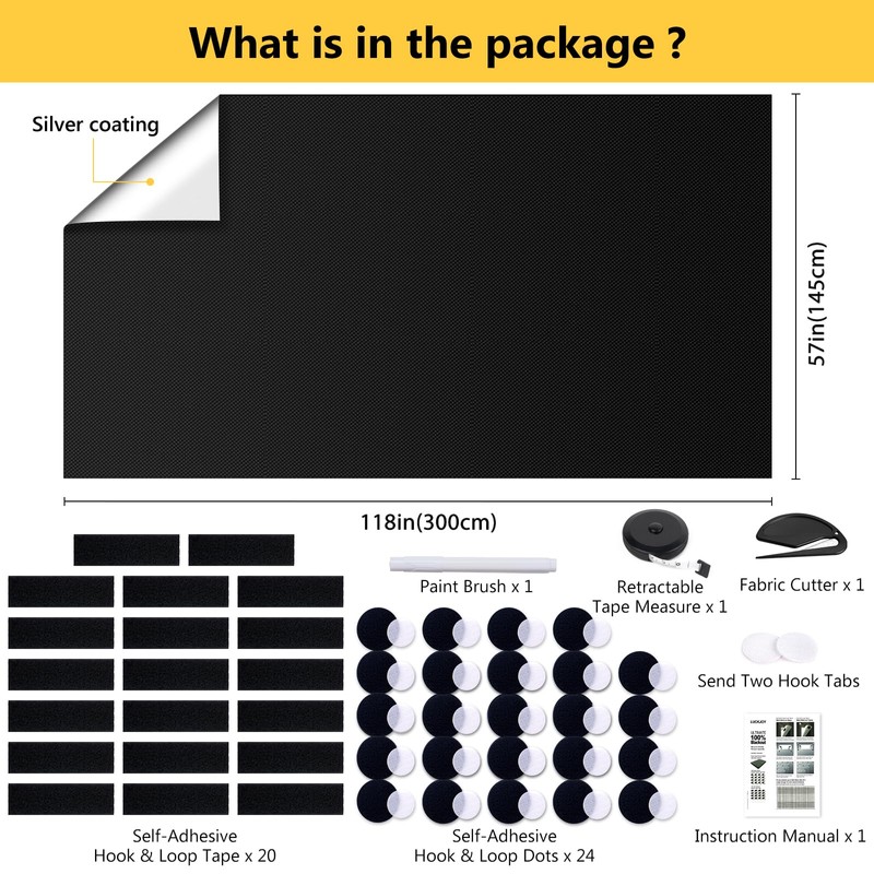 - 【Portable Blackout Gift】You can get a 118 "x 57" (300 x 145 cm) long blackout fabric, super strong suction cups & pairing loop tabs x 16, self-adhesive hook & loop tabs x 16 , retractable tape measure x 1, fabric cutter x 1, paint brush x 1, instruction manual x 1.Please read the manual carefully before use to understand the installation steps in detail.