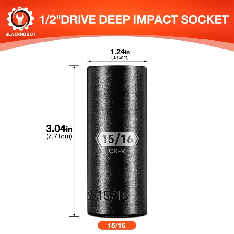 BLACKROBOT 1/2 Inch Drive 6-Point Deep Socket, 15/16 inch Deep Impact Socket, CR-V Steel
