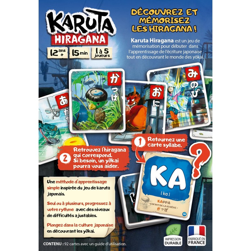 - ️ YOUR GOAL: hold the reader's role alternately and read a syllable card. The other players search for the appropriate card among the players spread out on the table. Once a player thinks they have found, they must touch the card and proclaim: "KARUTA!". If he has it straight, he wins the card. The first to win 5 cards wins the game. Turn the first syllable card written in French and try to find the corresponding card.