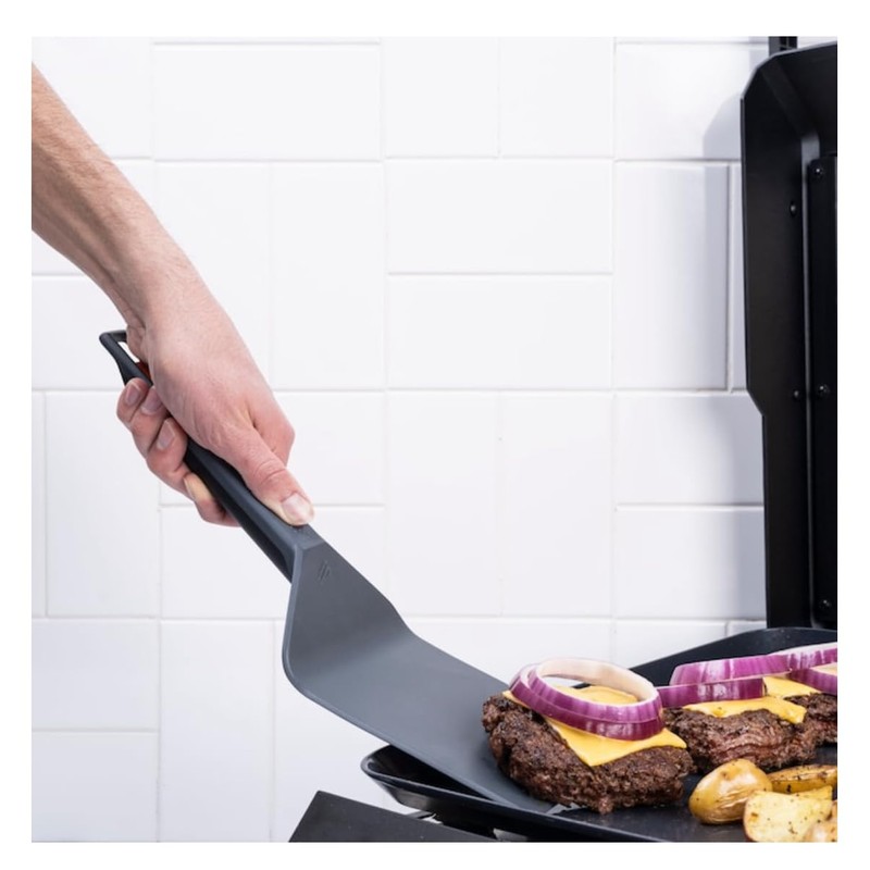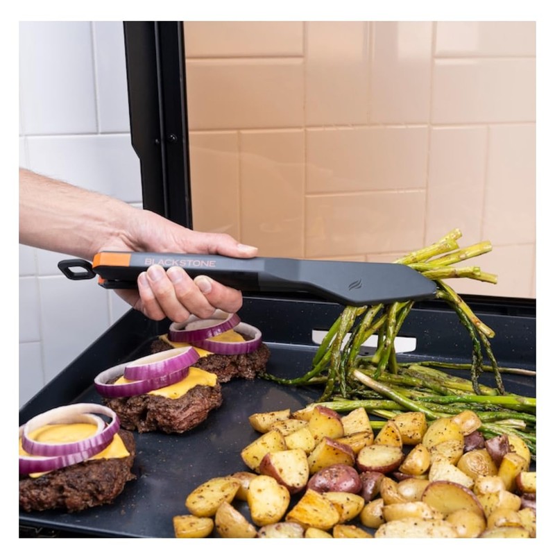 - Set includes a standard griddle spatula, a hamburger spatula, tongs, and a griddle scoop