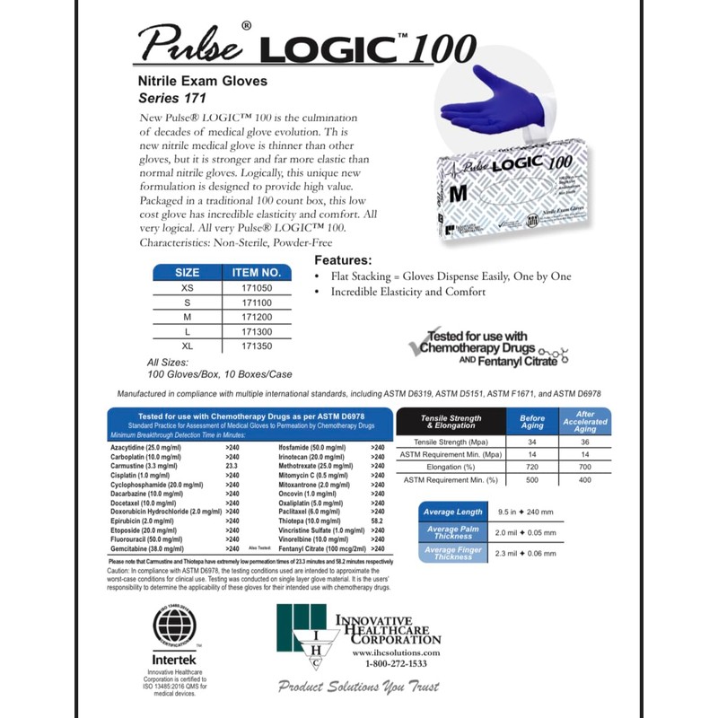 - NITRILE EVOLVED - IHC's Pulse LOGIC series 171 blue nitrile exam gloves are the culmination of decades of medical glove evolution. This new nitrile medical glove is thinner, stronger, and more elastic then ever before. Also each box comes with 100 cobalt blue gloves, this means that you get more gloves per box, making it a cost-effective solution for your medical glove needs.
