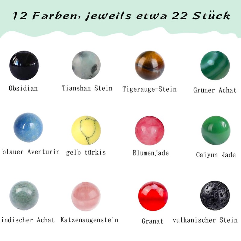 - Natural gemstone beads for jewellery: Our bead set contains 12 colours 8 mm natural stone beads, 22 pieces per colour, total 220 pieces beads. 50 pieces 2 different types of spacer beads and 5 different accessories for jewellery making offer more creative possibilities. You will also receive two different coloured elastic cords and a transparent plastic box. The jewellery crystals of each colour are housed in a separate plaid pattern, you don't have to worry about messy colours or the loss of gemstone beads.