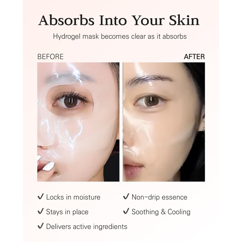 - HYDROGEL SHEET MASK TECHNOLOGY - an eco-friendly material that adheres to skin firmly, provides a cool-to-the-touch feeling on the face, and deposits a concentrated moisture serum