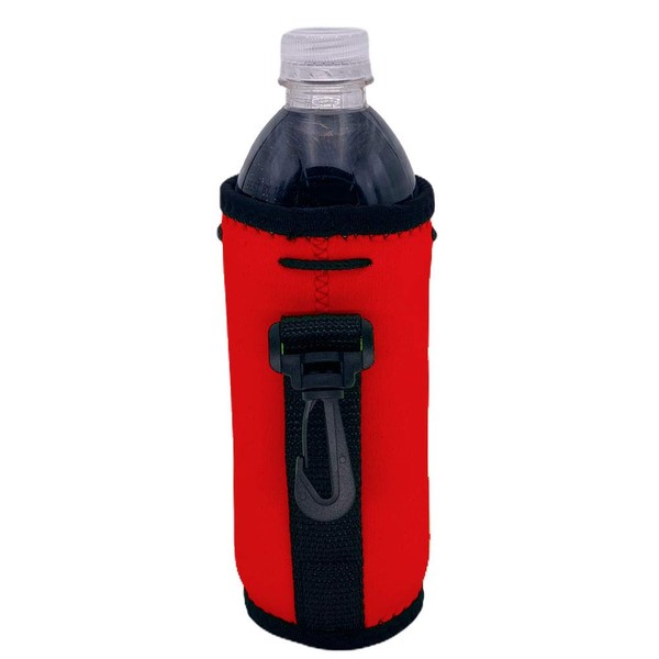 Fully enclosed sewn in neoprene fabric bottom. 1/8" neoprene material with fabric edge trim. Built to fit 16/17 oz. disposable plastic water bottles. Features plastic clip, drawstring and nylon finger handle. Keeps drinks colder longer and hands dry. Helps prevent surface damage by limiting condensation.