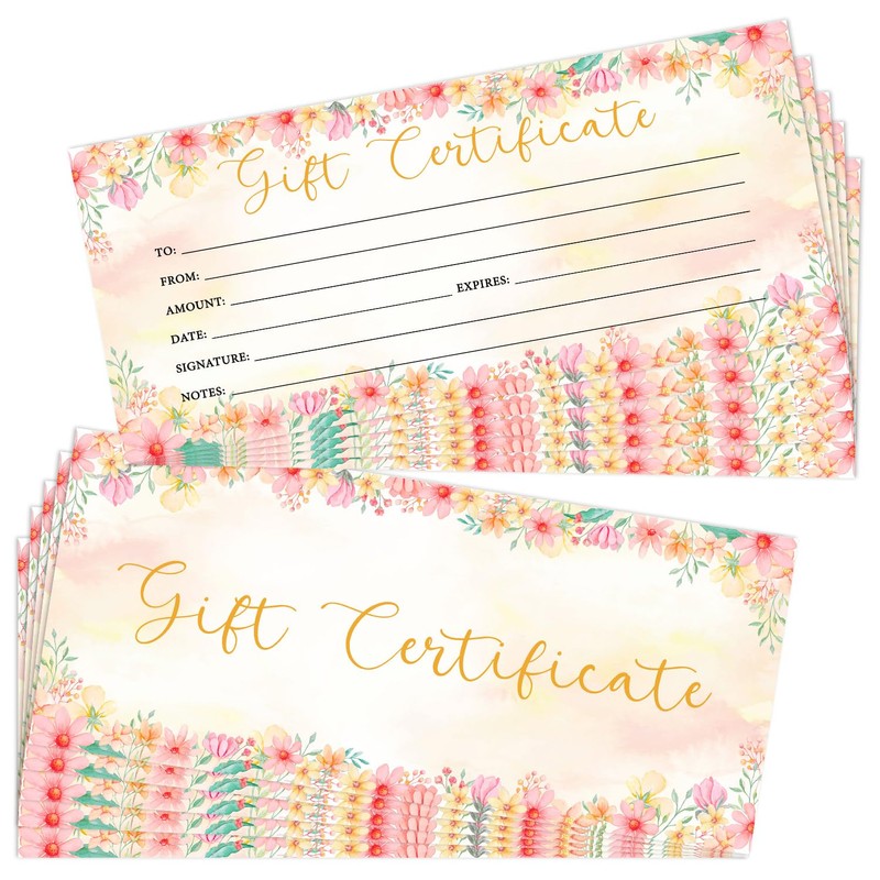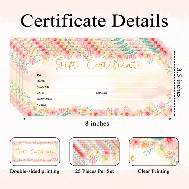 - Wide range of uses: These gift certificates are perfect for business and personal use, suitable for various occasions such as birthdays, salons, baptisms, restaurants, anniversaries, weddings, Thanksgiving, Christmas, etc.