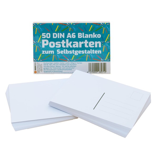 - 50 bright white DIY blank postcards in DIN A6 format (105 x 148 mm) made of sturdy, high-quality 300 g/m² paper.