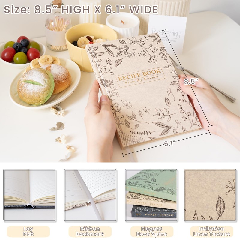 • Features: This Recipe Book to Write in cover is made of waterproof and grease-proof membrane material. This elegant empty recipe book is suitable for any cooking enthusiast. Size: 8.5 x 6 inches. Paper: 120 gsm thick bleed-proof paper. The sewing binding design allows this blank recipe book to lay flat.