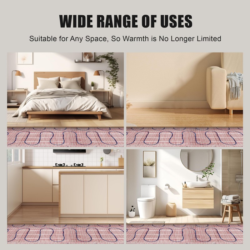 - INSTALLATION GUIDELINES: The radiant floor heating system comes with a detailed guide for installation and usage, helping you select the correct size. The heating mat is easy to install in showers, kitchens, wet rooms, living rooms, greenhouses, and more.