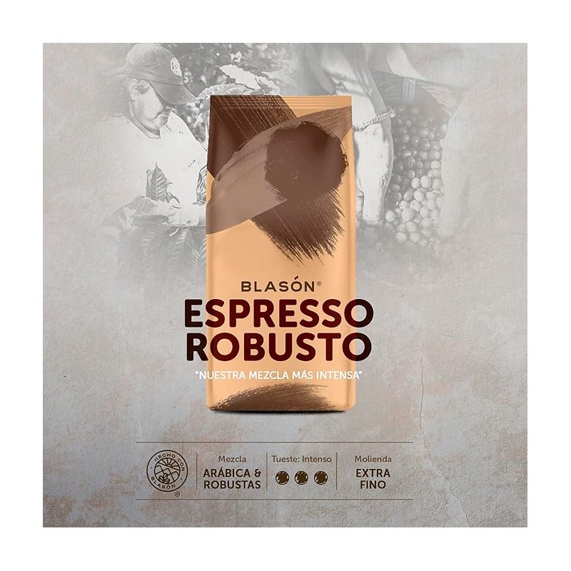Para los amantes de las experiencias de sabor intenso, el Café Blasón Espresso Robusto es perfecto para degustar de su tueste intenso y su molienda extra fina que ayudan a destacar su aroma y sabor intenso, con acidez y dulzor ligeros, de cuerpo prolongado. Consiéntete con sus sobresalientes notas de chocolate amargo y un dulzor ligero, despierta y acompaña cada una de tus mañanas con una taza de café Blasón. Disfruta de un trabajo hecho con pasión en una taza de Café Blasón. Pídelo en su presentación de 900 gramos para que nunca te quedes sin el placer de tomar café.