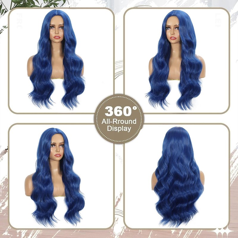 Blau Perücke Lange wellige Perücken für Frauen, Mittelteil flauschige lockige Perücke, natürlich aussehende synthetische hitzebeständige Faserperücken für die tägliche cosplay Partei