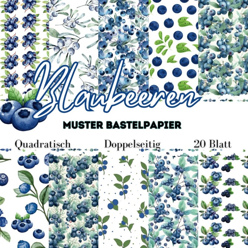 Blaubeeren Muster Bastelpapier: Heidelbeeren Scrapbooking Papier | 8.5" x 8.5", Quadratisch, Doppelseitig I Junk Journal I Decoupage I DIY Karten | Dekoratives Motivpapier | Obst Designpapier, Blau