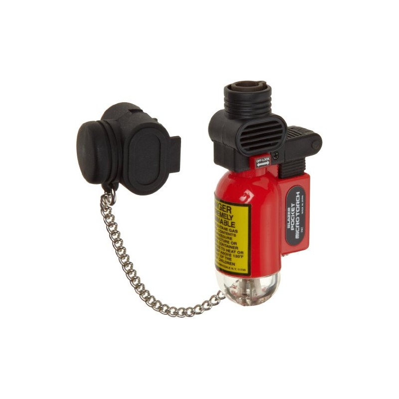 The micro torch houses a piezoelectric ignition system, which is based on a pressurized molecular reaction and requires no electrical connection. Piezoelectric energy occurs when the trigger is activated, releasing a small, spring-loaded internal hammer that strikes a crystal, producing a spark and resulting in gas flame ignition.