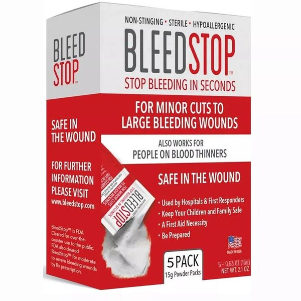 BleedStop First Aid Powder for Blood Clotting - 5 PK (15g) Pouches - Trauma Kit for Emergency Use
