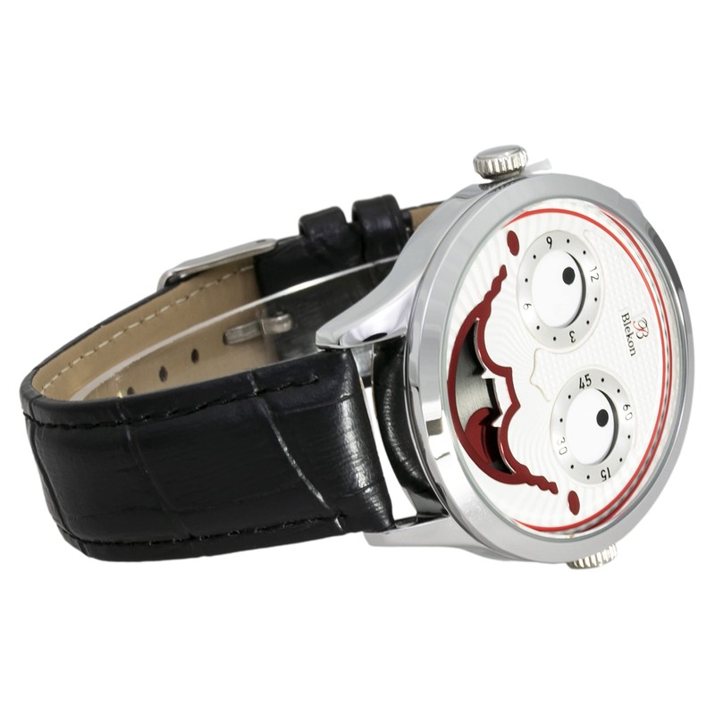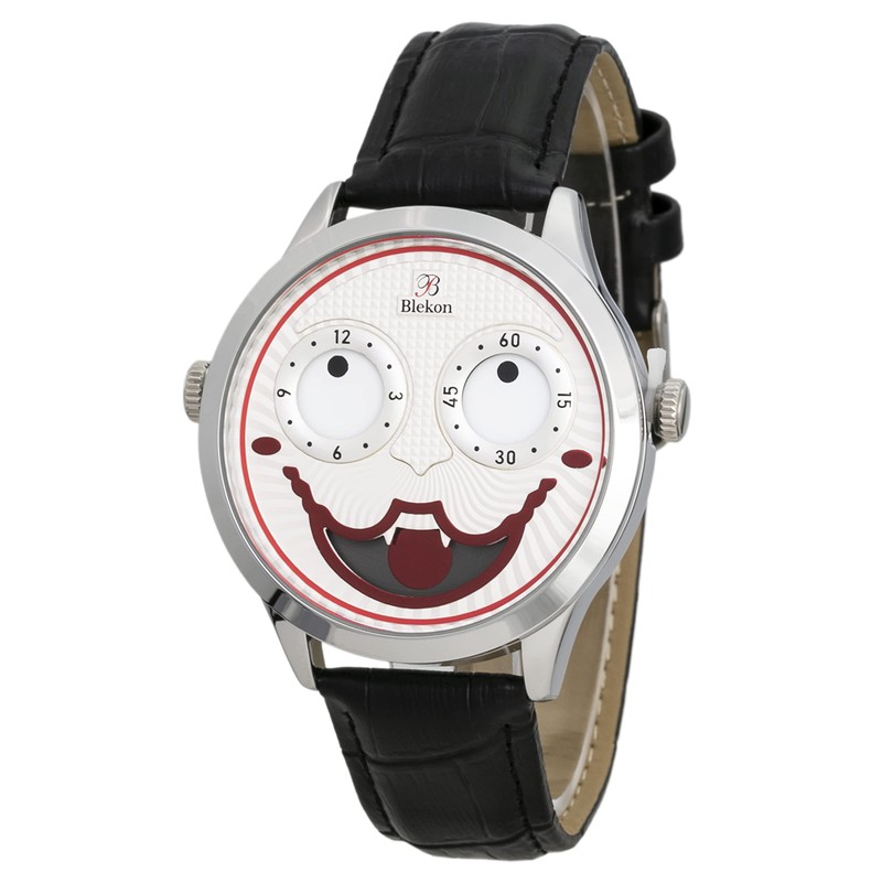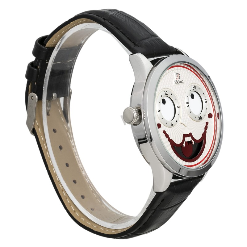 Blekon Collections Unisex 42mm Case Intricate Joker Face Genuine Leather Strap Watch (White/Silver)