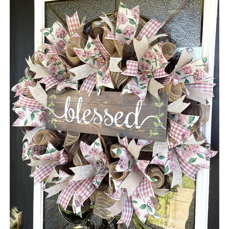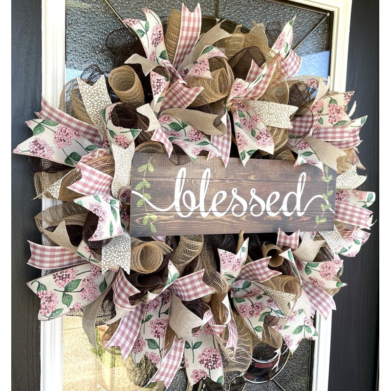Blessed Hydrangea Floral Dusty Rose Plaid Summer Fall Spring Deco Mesh Wreath, Front Door Wall Entryway, Patio Porch Garden, Living Room Bedroom Wall Decoration, Handmade Handcrafted