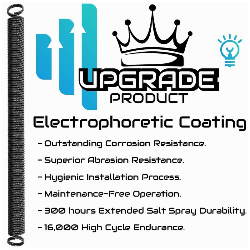 • High Quality: Crafted from professional ASTM-A228 spring steel coils, heat-treated for exceptional durability. Utilizes the latest electrophoretic coating technology for superior corrosion resistance and tensile properties. Withstands 300 hours of salt spray testing and a minimum of 16,000 cycles (a cycle represents one open and close of the door), eliminating the need for maintenance and keeping hands clean during installation.