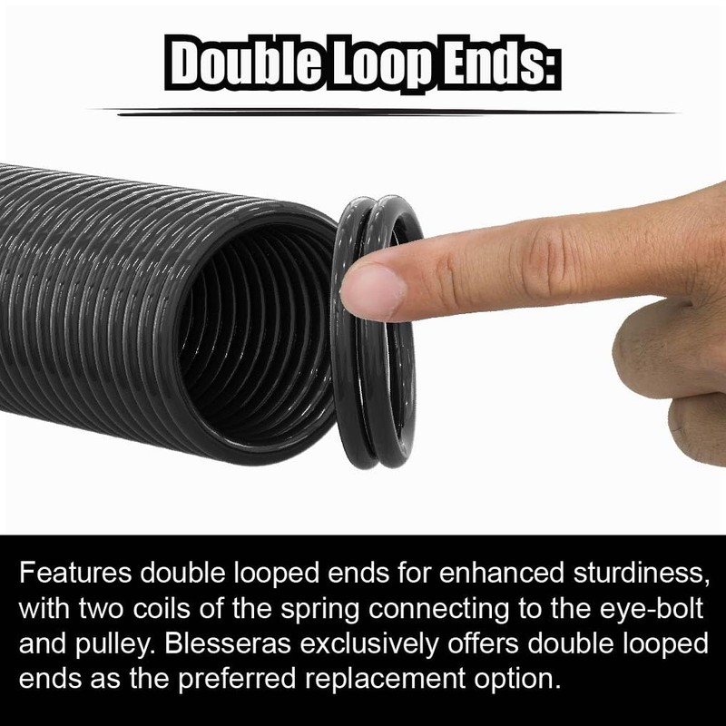 • Double Loop Ends: Features double looped ends for enhanced sturdiness, with two coils of the spring connecting to the eye-bolt and pulley. Blesseras exclusively offers double looped ends as the preferred replacement option.