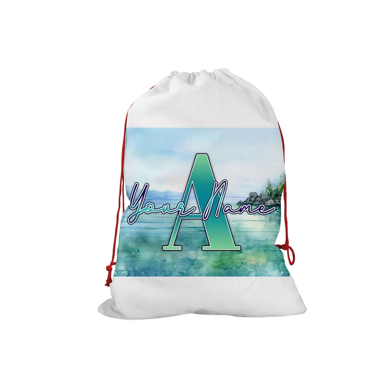 Bleu Reign Christmas Birthday Personalized Santa Sack Gift Wrap Bag Custom Name Nature Inspired Pattern Design Tranquil Water Reusable