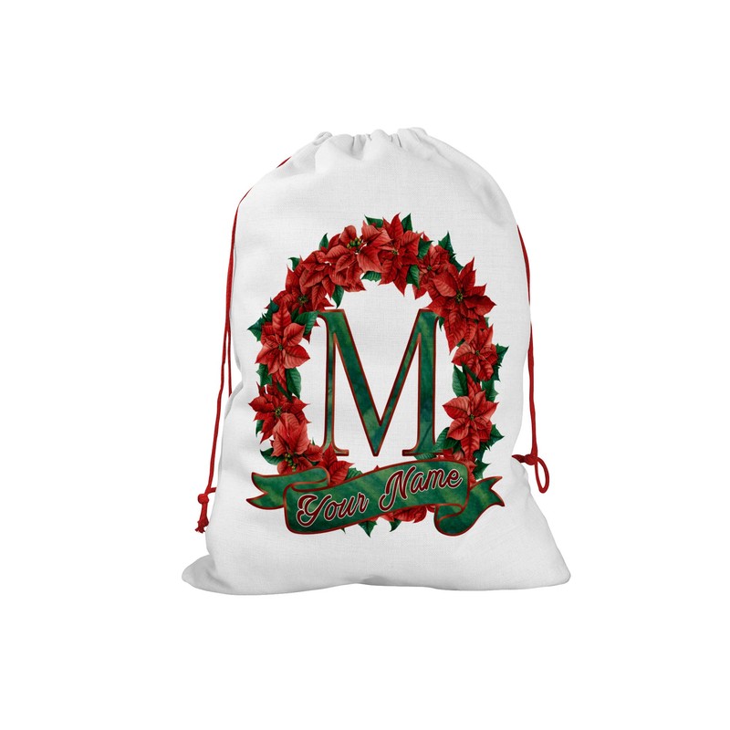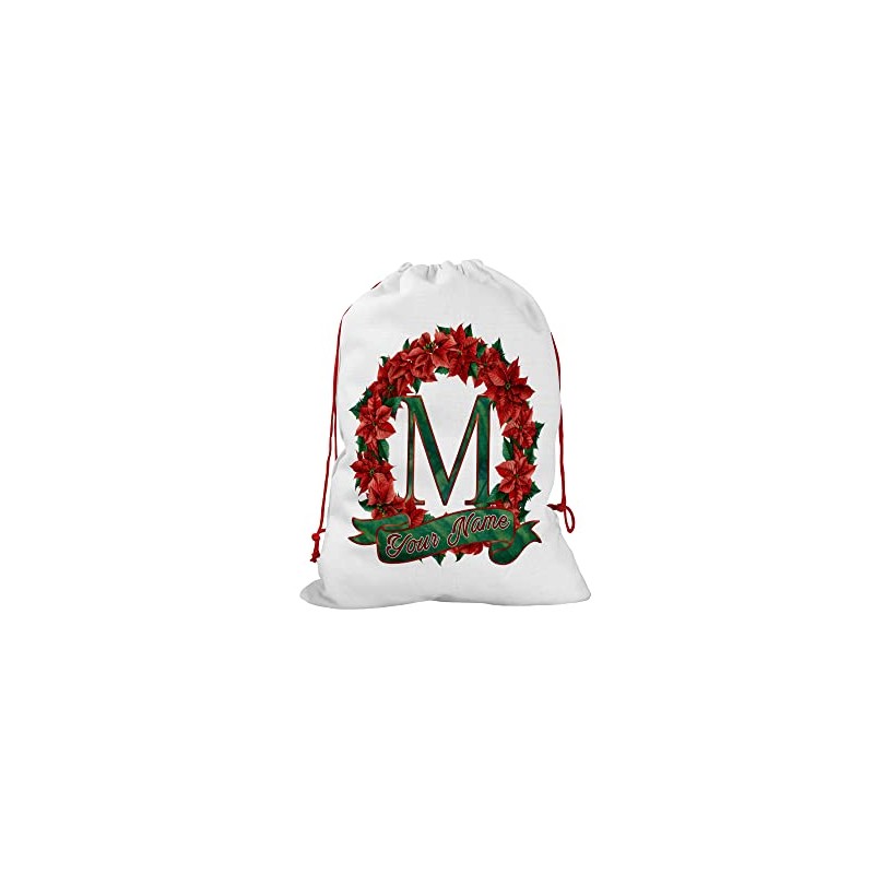 Bleu Reign Personalized Santa Sack Christmas Birthday Gift Wrap Bag Custom Name Poinsettia Wreath Monogram Letter M Reusable