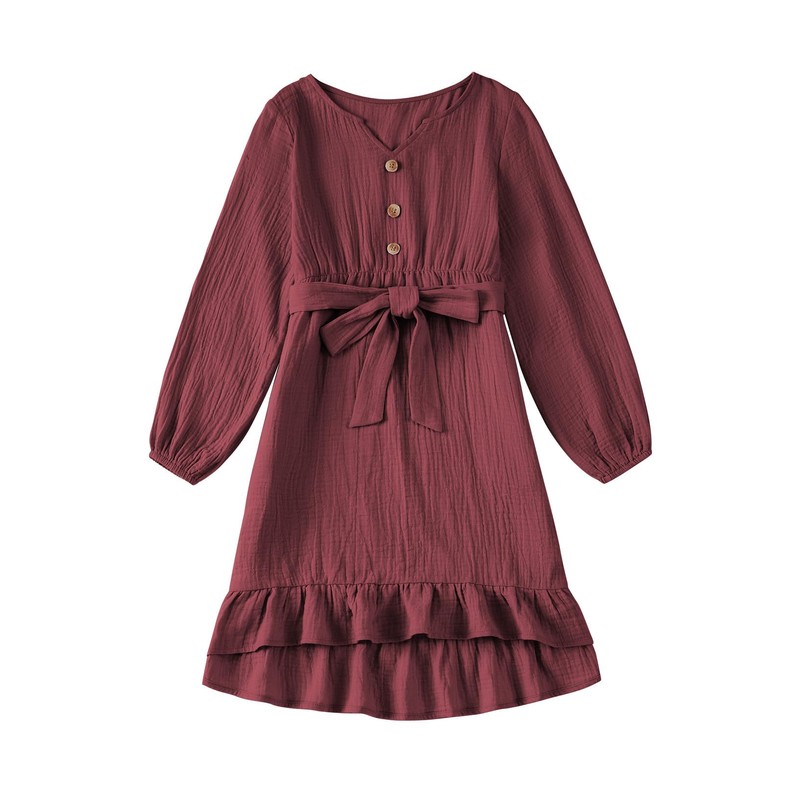 blibean Girls Fall Long Sleeve Cotton Dresses Tween Kids Ruffle Button Belted Flare Dress Little Girl Semi Formal Solid Casual Boho Fancy Party Clothes Spring Outfit Size 6-7 Year Old Dark Red