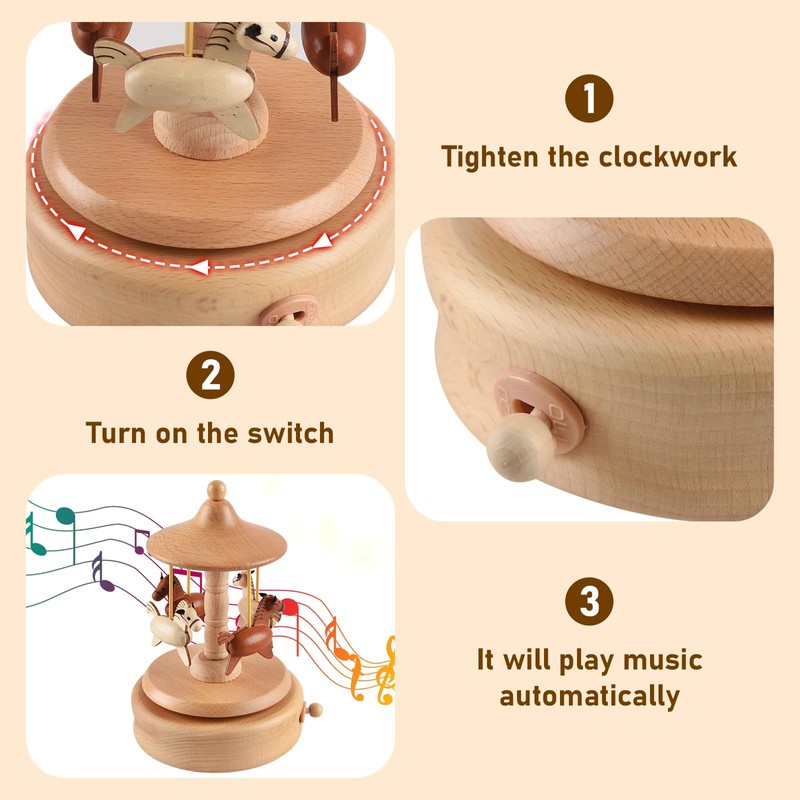 - Exquisite Gift Our music box is designed according to the principles of physical dynamics and magnets. When the music is played, the four wooden horses rotate according to the music. This carousel mechanical music box is a perfect Christmas gift for all ages. The beautiful design and meticulous workmanship make it an exquisite gift.