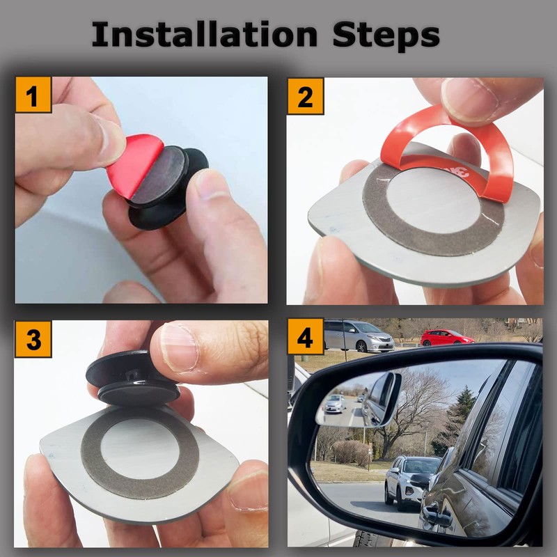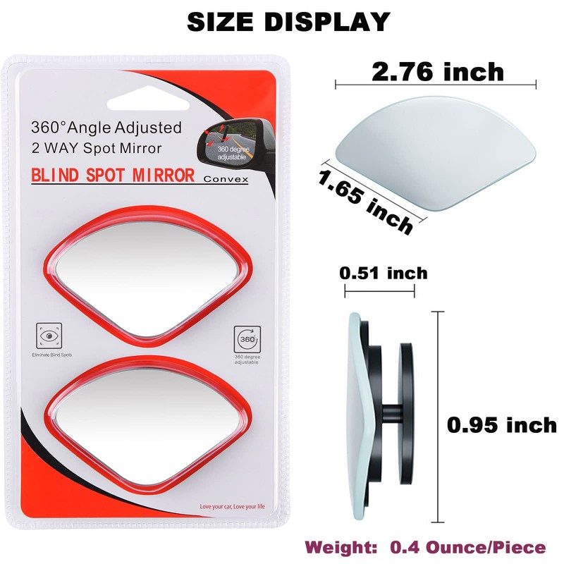 • 【More Safety】:Our fan shaped blind spot mirror helps you see clearly the blind spots in turning, lane change and reverse blind spots. Check road condition in real time, predict in advance. Prevent scratch collision and escort you and your family.
