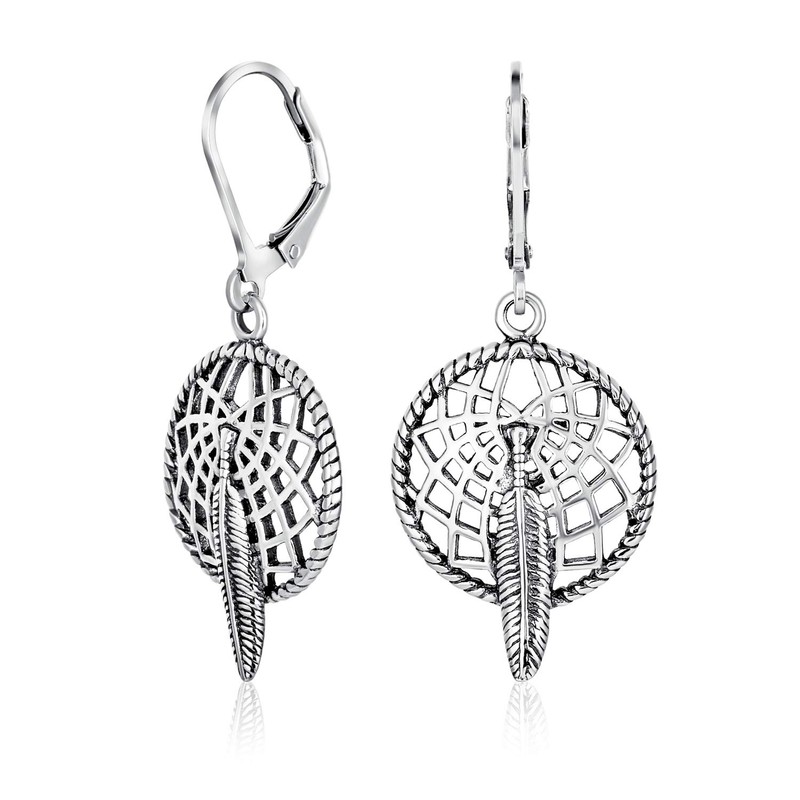 Bling Jewelry Leaf Feather Dream Catcher Dangle Leverback Earrings 925 Silver