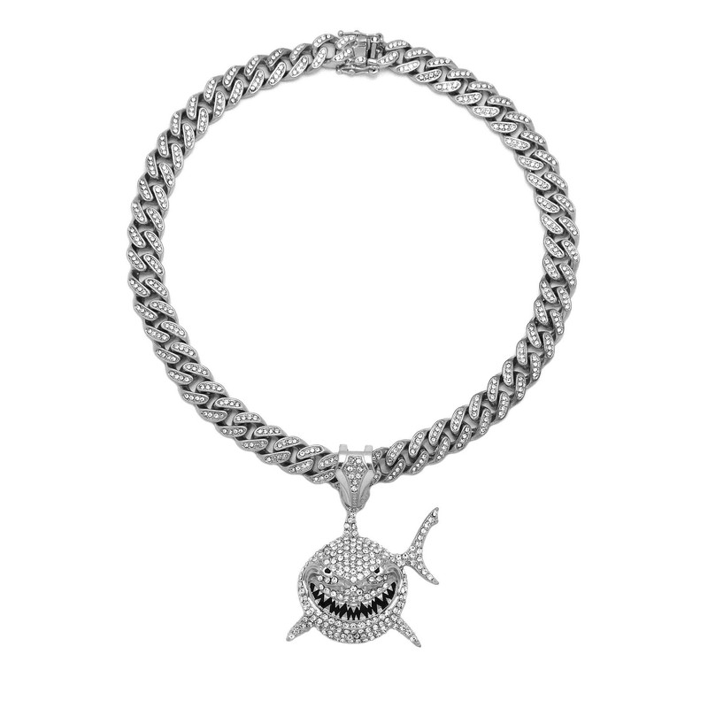 BLINGFACTORY White Gold Plated Lab Diamond Iced Shark Pendant & 16" 18" 20" 24" Iced Box Lock Cuban Chain Hip Hop Necklace (Pendant & 24" Chain)