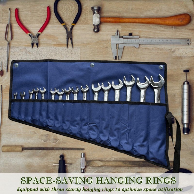 With 16 specially designed pockets, each tailored to securely hold various sizes of wrenches, this organizer ensures your tools stay neatly organized and easily accessible. No more wasting time searching for the right wrench; with this pouch, you can effortlessly locate the tool you need, saving valuable time and effort during your projects.