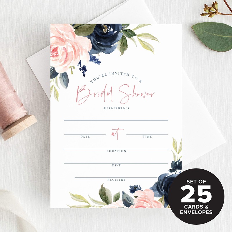 Bliss Collections Bridal Shower Invitations with Envelopes, Pack of 25 Floral Invites for Weddings, Showers, Parties and Receptions in Navy, Pink, Coral, Greenery, Fill-In Single-Sided Cards, 5x7
