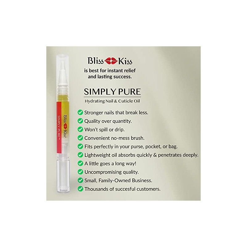 - Feeling Hopeless? If you’ve tried other nail strengtheners and nail growth treatments and been disappointed, you’ve finally come to the right place. Bliss Kiss nail and cuticle oil is hand-made with love and backed by nail science. No water. No dyes. No parabens. No preservatives. No mineral oil. No gluten. No almond oil. No fillers. No kidding. Each Simply Pure nail oil cuticle pen is hand-made with love in the USA since 2012. Remember, Bliss Kiss is best for instant relief & lasting success.