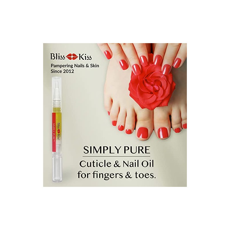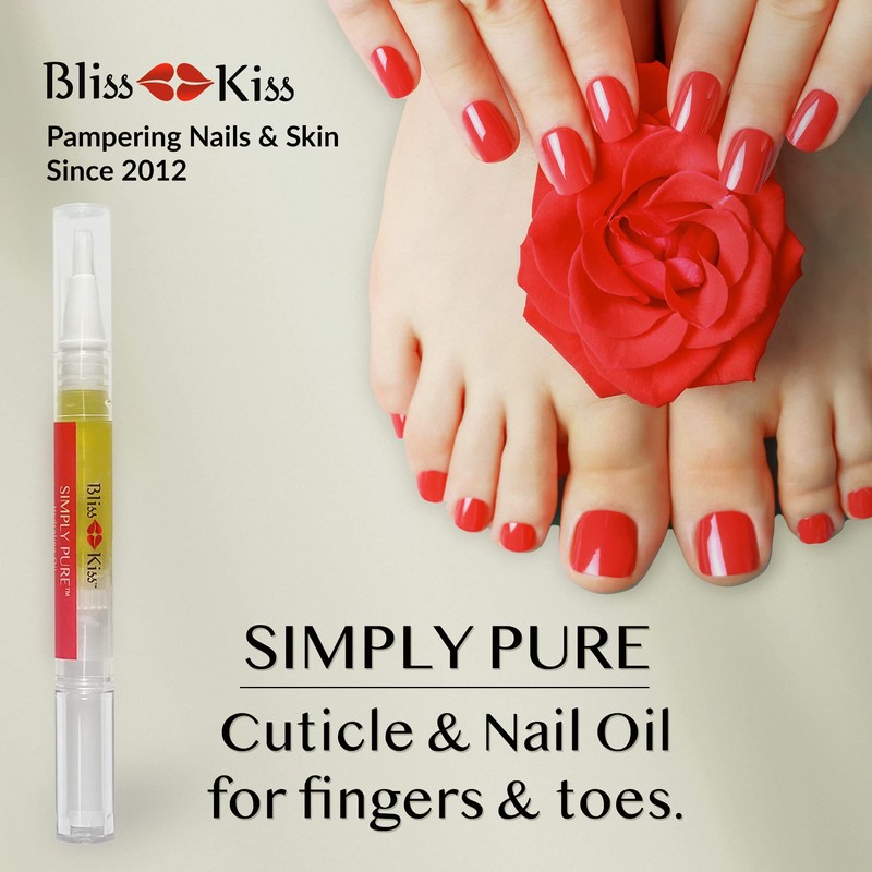 - Feeling Hopeless? If you’ve tried other nail strengtheners and nail growth treatments and been disappointed, you’ve finally come to the right place. Bliss Kiss nail and cuticle oil is hand-made with love and backed by nail science. No water. No dyes. No parabens. No preservatives. No mineral oil. No gluten. No almond oil. No fillers. No kidding. Each Simply Pure nail oil cuticle pen is hand-made with love in the USA since 2012. Remember, Bliss Kiss is best for instant relief & lasting success.