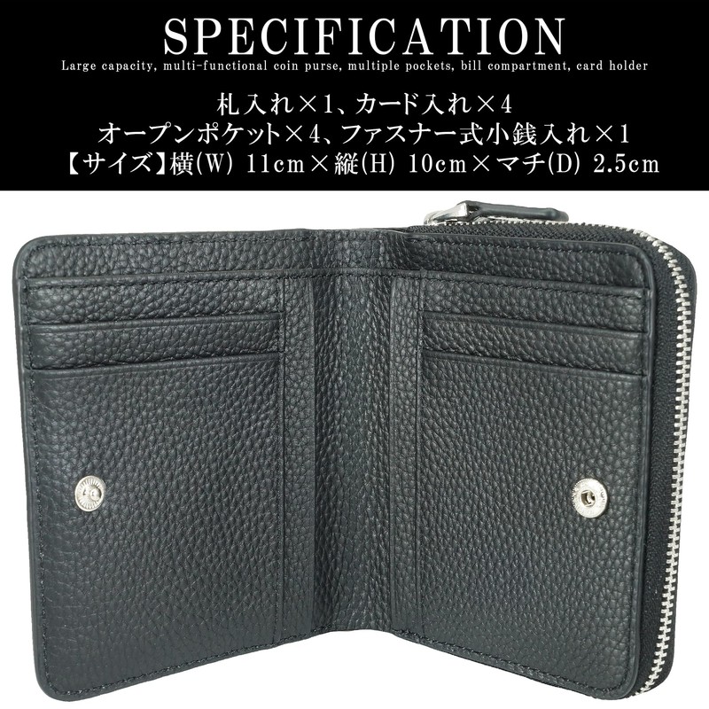 Specifications: Bill compartment x 1, card slots x 4, open pockets x 4, zippered coin purse x 1.