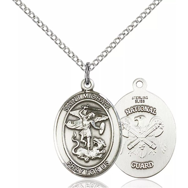 This finely crafted Saint Michael/National Guard medal pendant is made from solid .925 sterling silver, measuring 3/4 x 1/2 inches, and is dedicated to Saint Michael, the Patron Saint of Police Officers, Law Enforcement, EMTs, and Military Personnel. This beautiful medal honors the bravery and protection of those who serve, making it a meaningful gift for anyone in the US Army or National Guard. It comes with an 18'' Lobster Claw Sterling Silver Lite Curb Chain ensuring it's ready to wear or gift right out of the box.