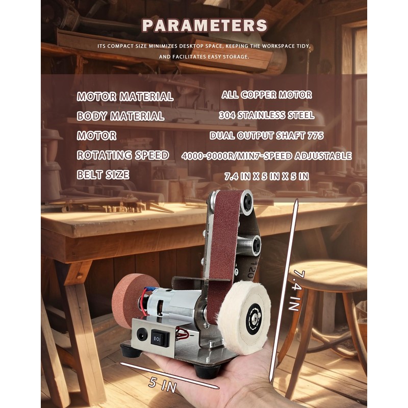 - Powerful Motor Sanding Machine: This bench sander,ideal for knife making supplies,features a dual-output shaft 775 motor with a 7-speed range from 4000 to 9000 RPM. The small belt knife sharpener’s direction for metal working can be easily switched between forward and reverse using the button next to the power source.