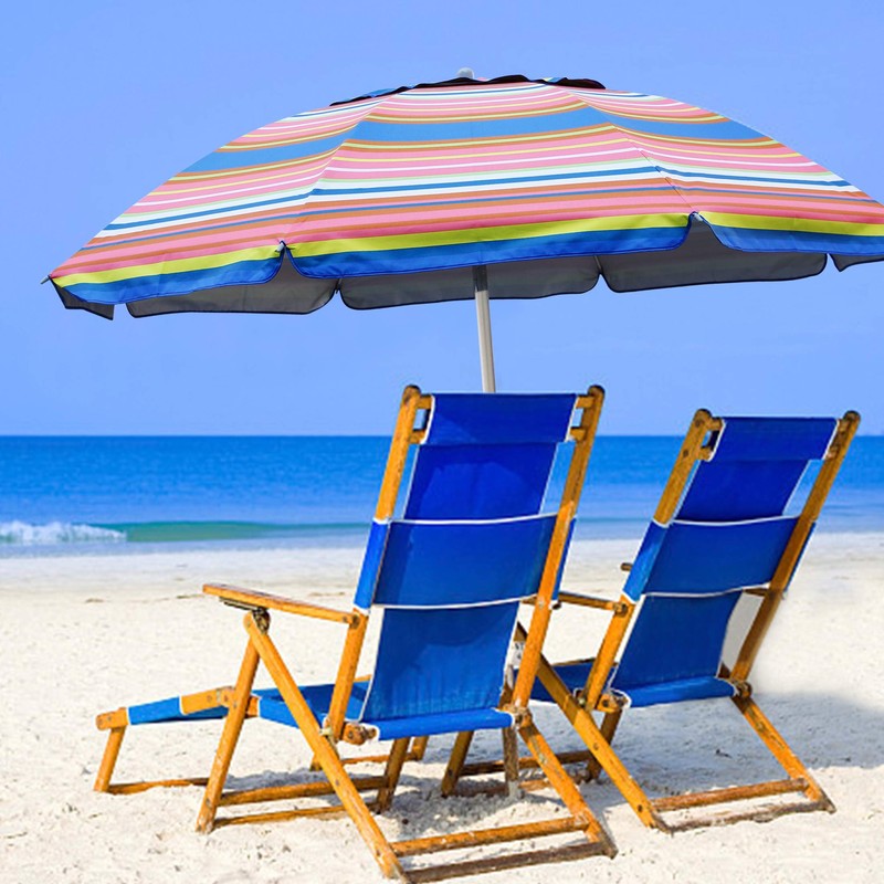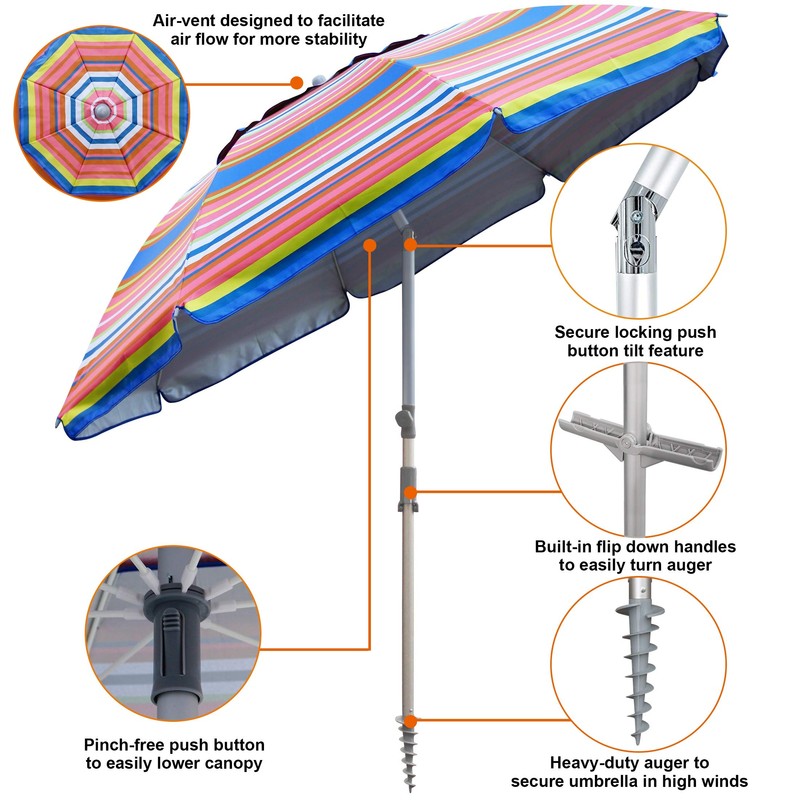 - Heavy-duty sand anchor to secure umbrella in high winds. Built in, flip down handles to easily turn auger.