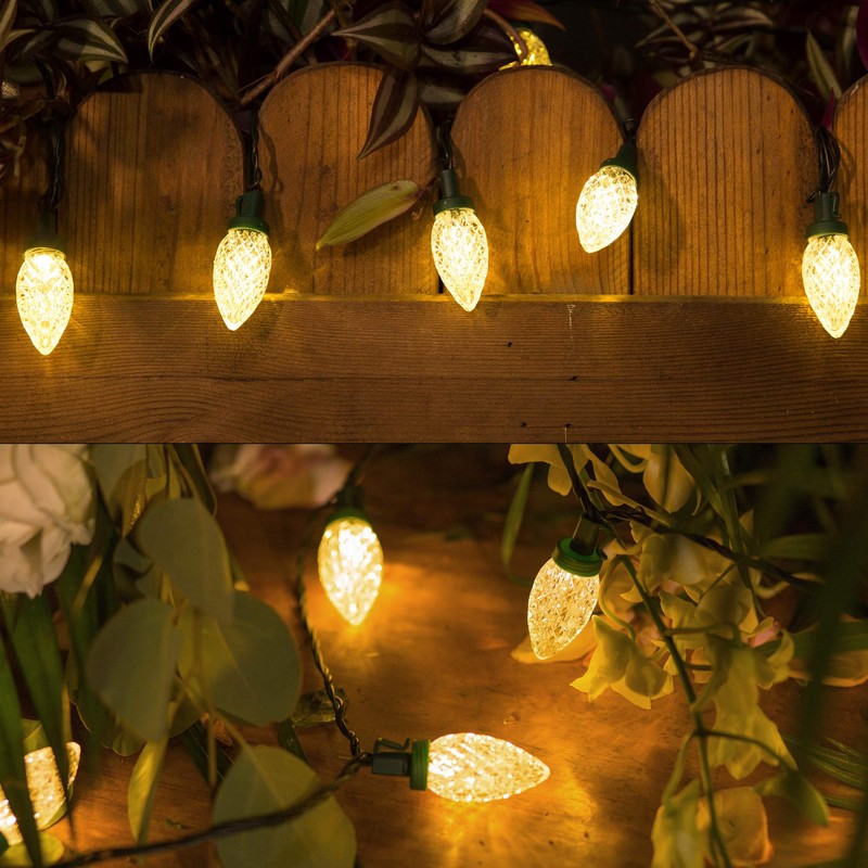 - Strawberry Shaped: This C9 led Christmas lights are cute strawberry shaped design, unique and lovely, the diamond faceted bulb reflects a spectacular light, perfect for hanging across rooftops, wrapped around large outdoor trees and create a cheerful atmosphere for Christmas party, wedding or other holidays!