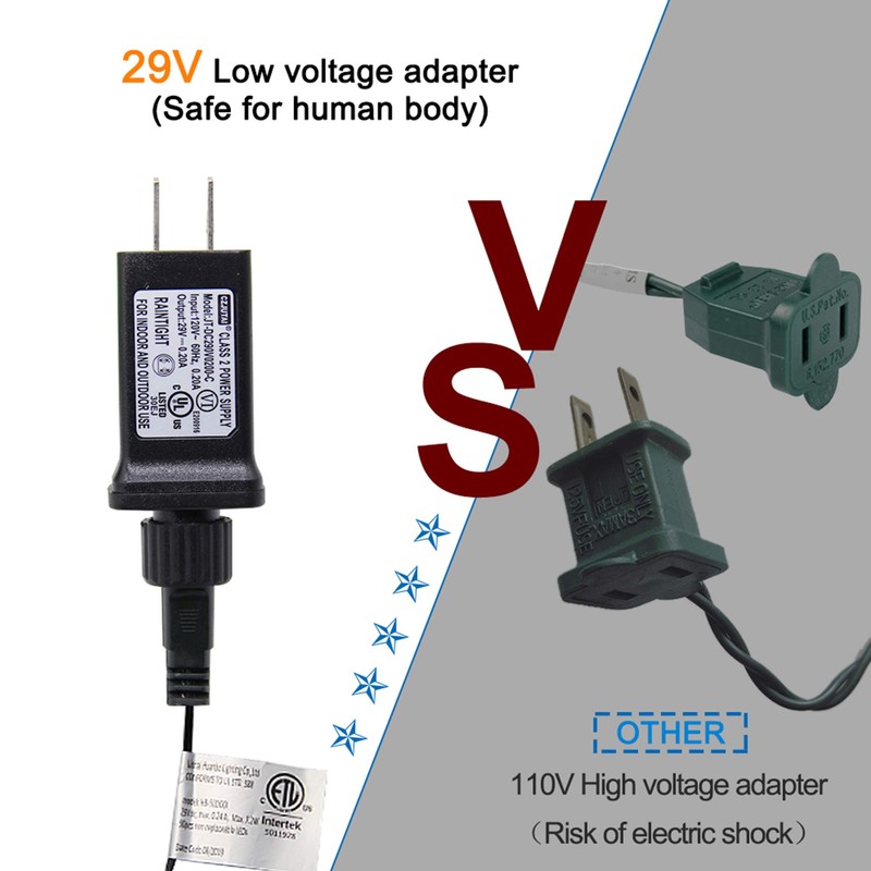 - Highly Safety & Energy Saving: UL Listed, 29V Low output adapter ensure the safety, just plug in and unplug it for power on and off. The strong construction makes this Christmas string lights tough and sturdy, which will keep at a low temperature state after long hours of usage. LEDs are made of high durability and the energy efficiency material, saves up to 80% energy compared to traditional incandescent bulbs.