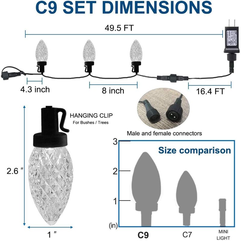 - C9 Christmas Lights: This 49 ft LED C9 Christmas lights comes with a super long 16 ft leading wire for convenient use. With 50 warm white led lights, are sure to bring brightness to your home, add a warm and charming atmosphere to spice up your holidays.