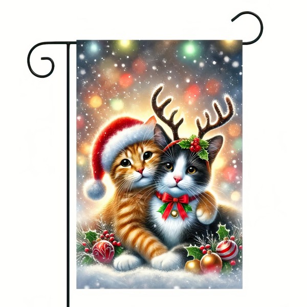 • Adorable Christmas Cat Design: This festive cats garden flag features two cute cats, one wearing a Santa hat and the other with reindeer antlers, bringing a playful and heartwarming touch to your outdoor holiday decorations.