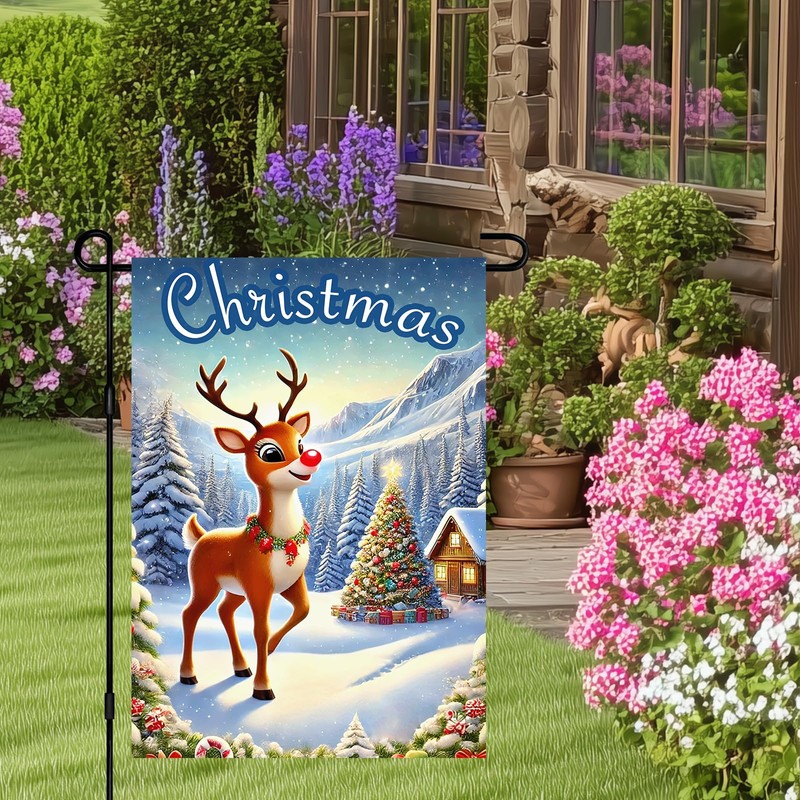- Festive reindeer design with snowy charm: This Christmas garden flag features a cheerful red-nosed reindeer standing in a snowy wonderland with mountains trees and a twinkling Christmas tree for a classic winter holiday vibe.