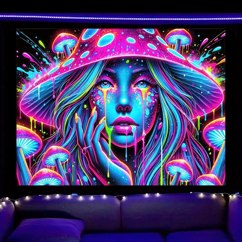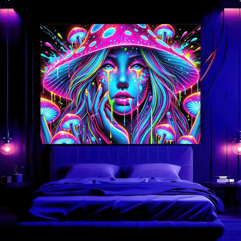 - Vibrant Psychedelic Design:This mushroom goddess glowing tapestry features a stunning neon mushroom design with vivid fluorescent colors that create an eye-catching visual effect. Its intricate details and glowing accents make it a unique centerpiece for your bedroom, living room, or party decorations. Ideal for those who love psychedelic art or bright, colorful room aesthetics.